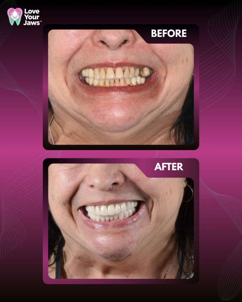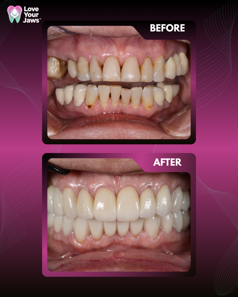 At Love Your Jaws, we restored function and health by removing failed implants, clearing jaw infections, and placing high-quality implants for an “All-on-X” full-arch reconstruction with immediate prosthetic loading. This advanced technique allowed us to rebuild the entire arch of teeth with a minimal number of implants, providing immediate functionality and aesthetics. The result? A vibrant, confident smile and a fully restored quality of life.